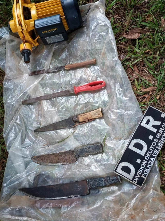 Entre los objetos secuestrados también se hallaron una bomba de agua centrífuga de dudosa procedencia, tres cuchillos de fabricación casera y dos linternas a pilas, elementos comúnmente asociados a la caza furtiva y posibles hechos de abigeato.